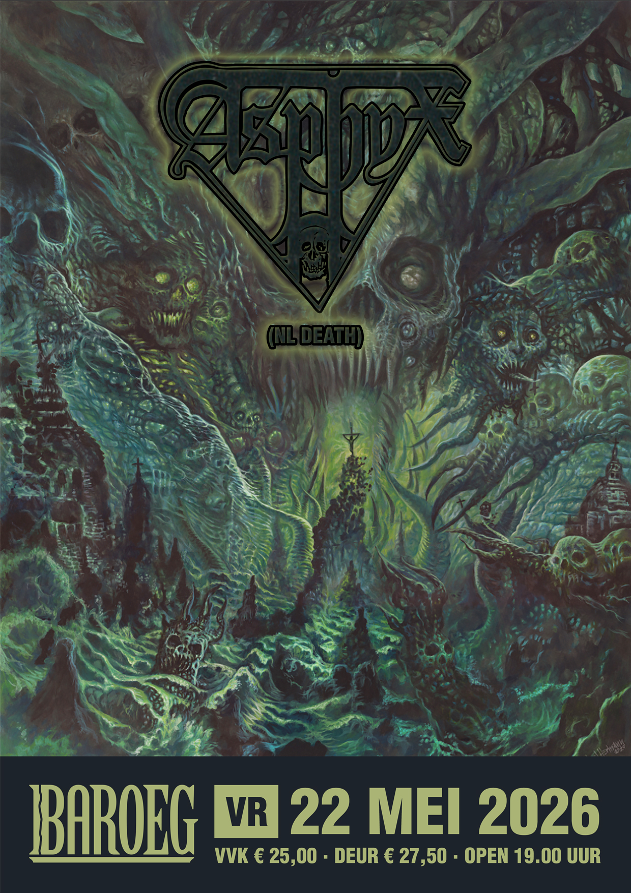 Asphyx speelt in de nieuwe Baroeg! Eén zin van zes woorden zou voldoende moeten zijn. Het gaat dan ook niet over zo maar een band. Nee, het gaat over een instituut. Als sinds de jaren 80 van de vorige eeuw draait dit gezelschap in wisselende bezetting mee in de death metalwereld. De huidige bezetting is sinds 2014 stabiel. En doet wereldwijd van zich spreken als een geolied pantservoertuig. Niet om de hete brei draaiend telt slechts één ding: Death, the brutal way!