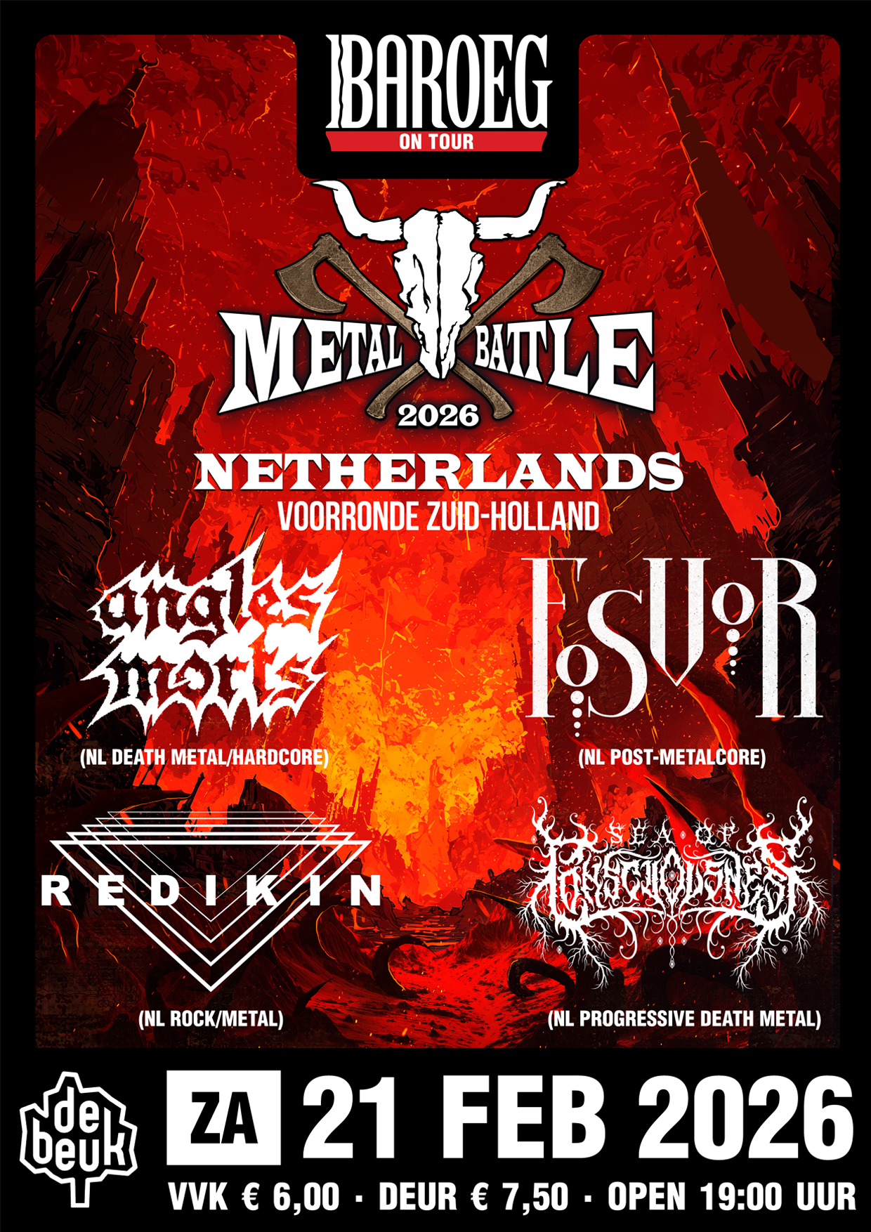 De jaarlijkse Metal Battle is weer terug. Net als vorig jaar organiseert Baroeg de voorronde voor Zuid-Holland in De Beuk in Barendrecht. Er zijn weer vier bands geselecteerd die strijden om een plek in de Veldslag West.