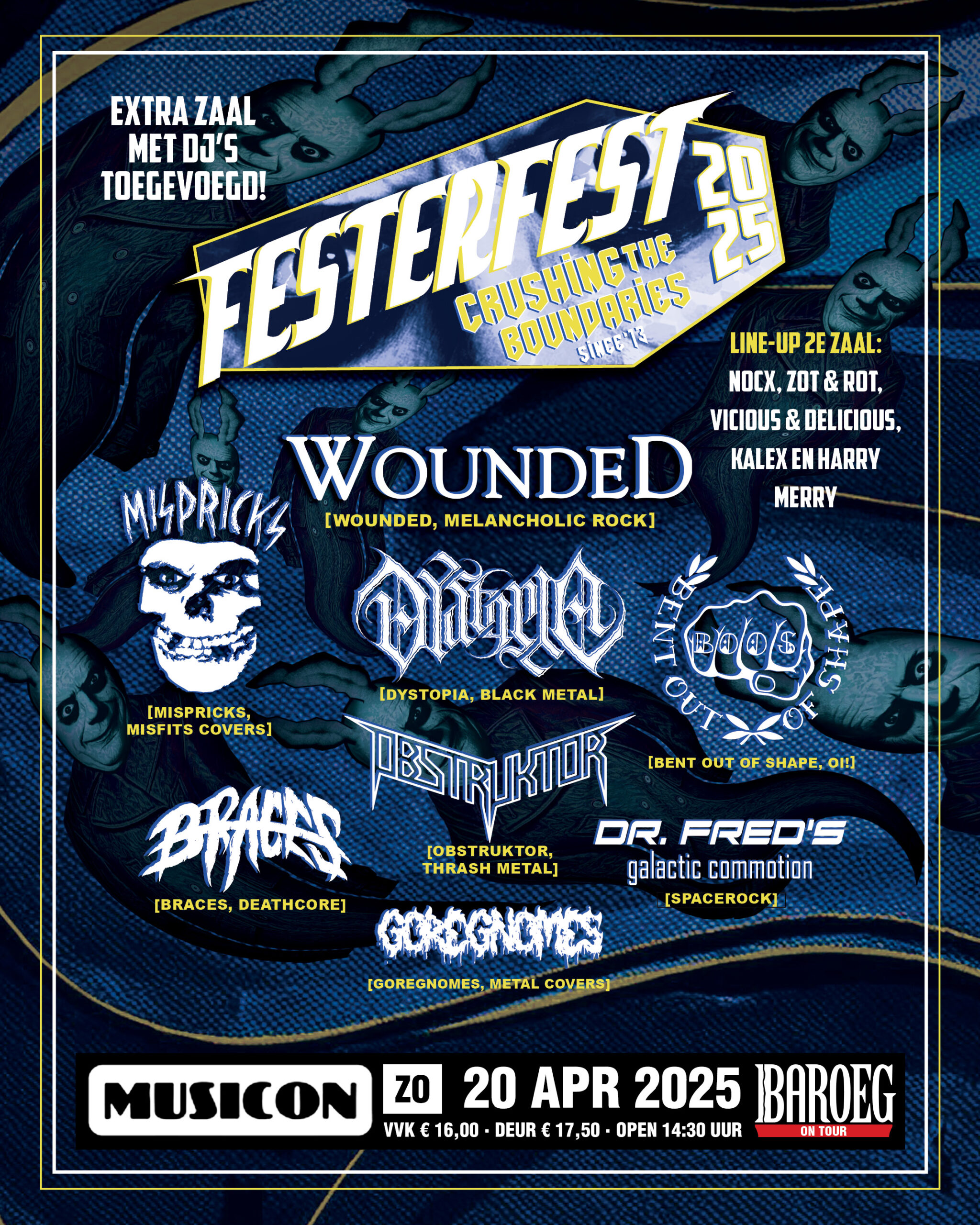 Op eerste paasdag is er weer een nieuwe editie van Festerfest. Vanwege de sloop en nieuwbouw van Baroeg wordt het een Baroeg On Tour en zal het in Musicon, Den Haag plaatsvinden. Bereid je voor op een programma naar Festerfest-standaarden, dus hoge diversiteit en kwaliteit binnen de underground.