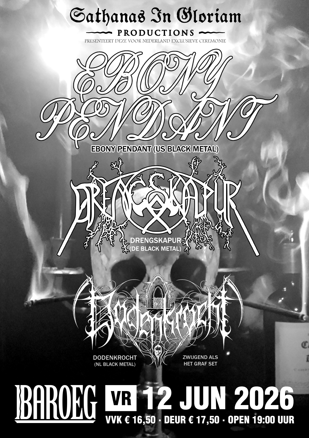 Ebony Pendant is een eenmansproject uit Seattle, Washington dat sinds 2019 een demo, twee split-releases, een EP en drie langspelers heeft uitgebracht. Simon Coseboom, het zwartgeblakerde brein waaruit Ebony Pendant is voortgesproten, beheerst als geen ander de zwarte kunst van het maken van uiterst agressieve, rauwe en snelle black metal, maar met een immens gevoel voor fantastische melodielijnen verwerkt in geweldige songstructuren. De muziek van Ebony Pendant is duidelijk zwaar geïnspireerd op de jaren 90 Noorse traditie. Ebony Pendant komt voor de eerste keer naar Europa voor een select aantal optredens. Sathanas In Gloriam Productions heeft Ebony Pendant al jaren op de radar en is vereerd te zijn verkozen voor het verzorgen van het enige optreden in Nederland van deze zeer exclusieve band, nota bene in de hagelnieuwe en verbeterde black metal tempel van weleer Baroeg. In Amerika heeft Ebony Pendant live een goede reputatie opgebouwd vanwege zeer intense en strak gespeelde shows. De ware underground black metal liefhebber grijpt dus zijn kans en laat dit optreden niet schieten, want welke boeker durft heden ten dage nog een tour op te zetten voor underground bands uit de VS? Zeer waarschijnlijk is dit dus je enige kans om de genialiteit van deze band live te kunnen ervaren!